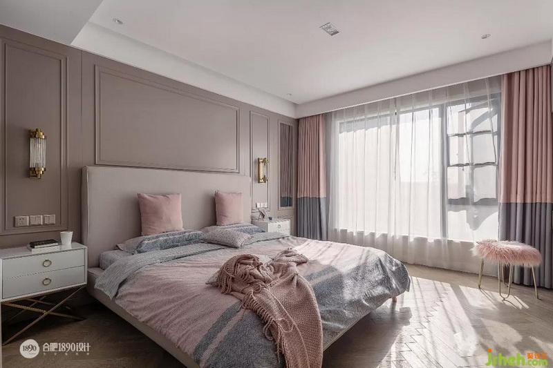 室內(nèi)設(shè)計(jì)師在床頭背景的護(hù)墻板延續(xù)了客廳的色系,造型上少許增加了點(diǎn)線條,作為以此區(qū)別,軟裝搭配上也更是延續(xù)了整體一致的格調(diào)。