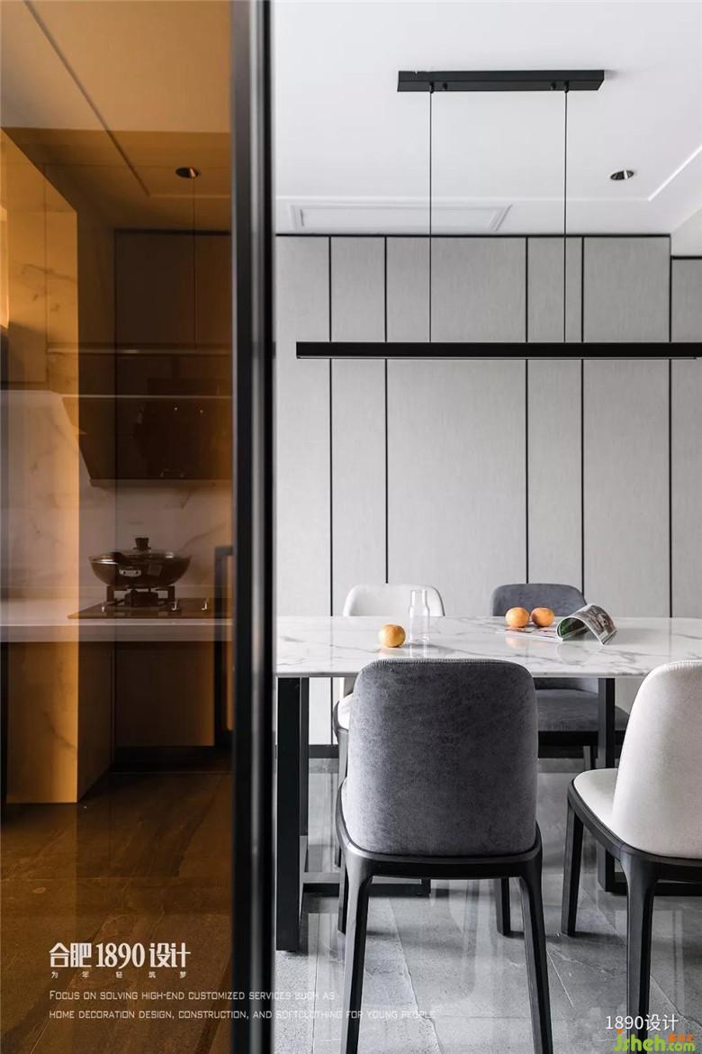 高級灰的布墻布系統(tǒng),不同分割的金屬線條點綴,提升空間的耐看度與品質(zhì)感,極簡的餐廳吊燈,聚焦視線,讓空間更有層次。