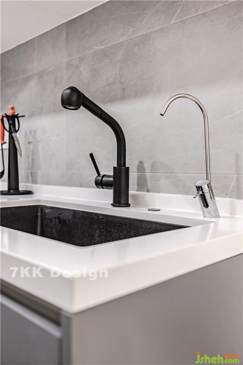 L字造型廚房,操作臺非常重要根據(jù)需求的高度進行設(shè)計,否則會造成靈活困擾。淺灰色的鋪設(shè)更注重開放性、冷色調(diào)。給人一種清爽的感覺,減少了不必要的裝飾線條,水槽采用石英石的水斗,旁邊的不銹鋼水管可以直接供應(yīng)給客人直飲水。烤箱按在了下面,微波爐選用可移動式,抽屜式的廚門放置碗具。