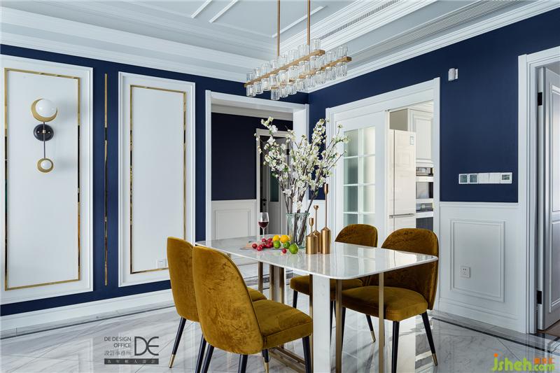 通透的采光將粉藍搭配的美發(fā)揮到極致,客廳以深灰色為主調,部分墻面的藍色,與深藍沙發(fā)達到了統(tǒng)一,輕奢風格的金屬元素,使浪漫精美的居室空間也不失輕快與活力。