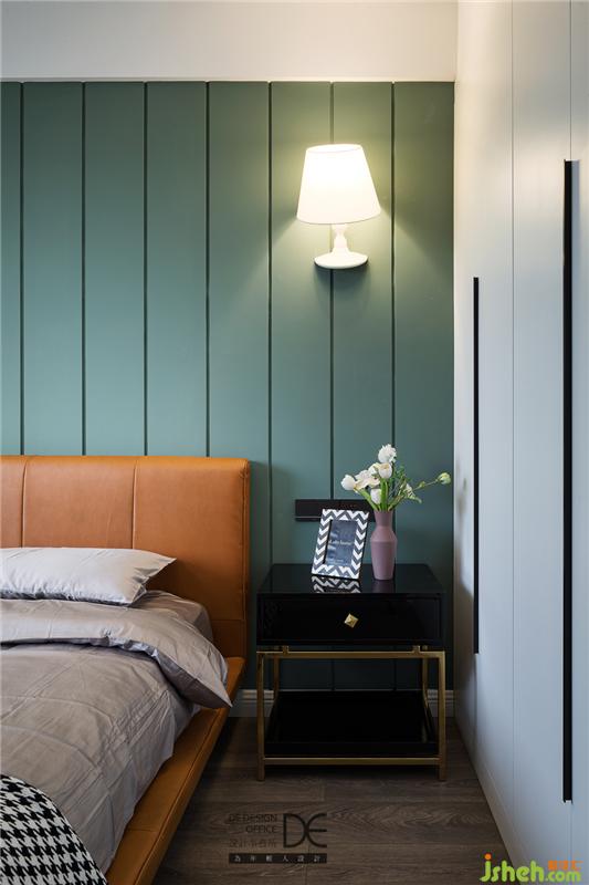 用石膏板拼縫,刷上清新的綠色,沉穩(wěn)造型配上活躍色彩,營造出主人房氛圍;土黃色大床配上黑色床頭柜,看似雜亂實則穩(wěn)中有序,涌出溫馨典雅的格調。工作勞頓后,回到房間時自然將繁雜之事拋于腦后,享受這份身心愉悅之感。