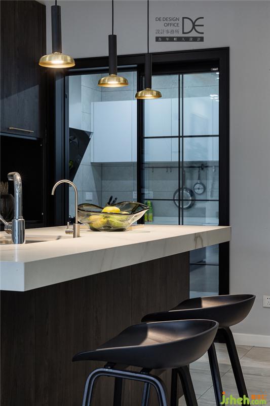 娟姐先生對設計師提出的唯一要求就是餐廚空間要滿足川菜制作條件和朋友間美食互動的條件。老薛將中廚空間+西廚空間+餐廳空間一字排開,完美滿足了男業(yè)主的需求。