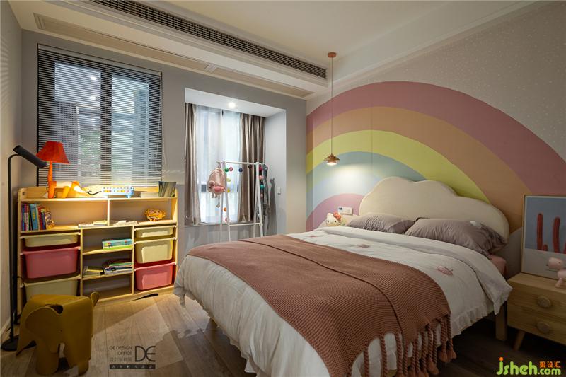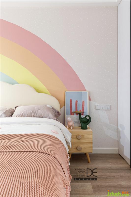 小公主的兒童房以灰色與粉色的搭配為主,同時(shí)預(yù)留了多個(gè)區(qū)域,滿足小朋友不同階段的不同需要,七色彩虹的床頭背景描繪出小朋友天真浪漫的童年時(shí)光。