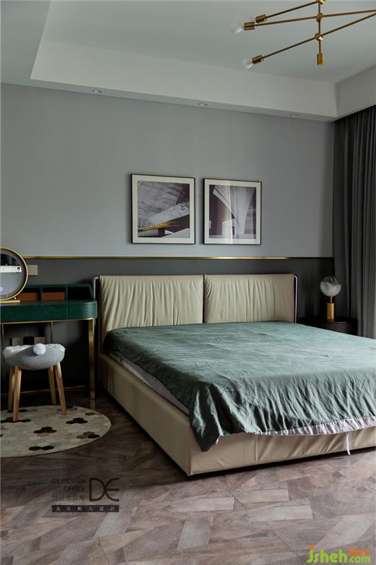 主臥以灰色為基調(diào),加入綠色點綴,清爽而溫暖。背景掛畫與地面紋理相照應,和諧舒適感油然而生,金屬線條的裝飾,更是為這個空間添色不少。