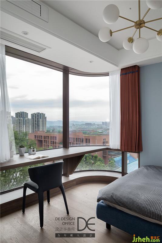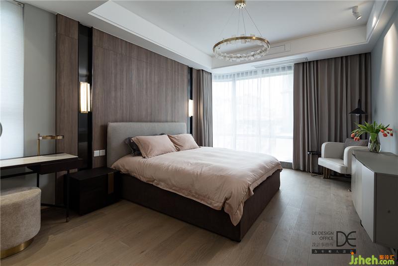 在重新規(guī)劃了戶(hù)型結(jié)構(gòu)之后,老人房依舊足夠?qū)挸ā3练€(wěn)的配色,冷而不冽,單椅和金屬落地?zé)魺o(wú)形中為這里增色不少。