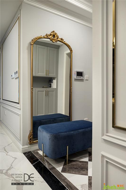 入戶設(shè)置了換鞋凳和更衣鏡,實(shí)用而美觀,精致的線條呼應(yīng)美式輕奢的優(yōu)雅,在金屬的點(diǎn)綴下,室內(nèi)設(shè)計(jì)師用復(fù)古之感拉開了這個(gè)家的序幕……