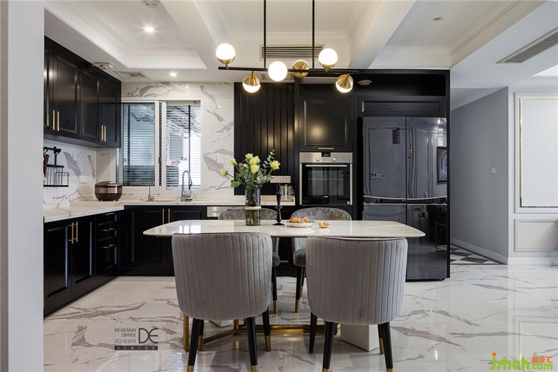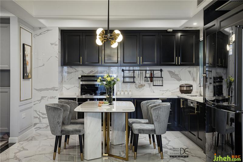 開放式廚房是最能拉近家庭成員在生活過程中的交互關(guān)系的,每位家庭成員都可以或多或少的參與到烹飪過程中,大人們擇菜、烹飪,小朋友在一旁玩耍,盡享三代人的天倫之樂。溫柔浪漫的女主人不忘在廚房也掛上一幅唯美的畫,飯菜香一點(diǎn),生活甜一點(diǎn)……