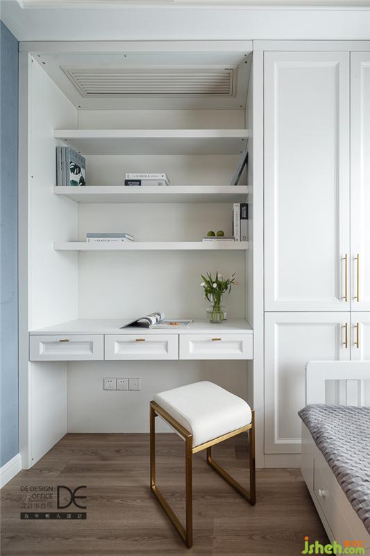書房主打白色調(diào),加以部分藍色點綴,清新整潔。榻榻米與書柜、書桌的結(jié)合,讓房間功能變得豐富,集儲物收納、學(xué)習(xí)辦公、休息睡眠為一體。