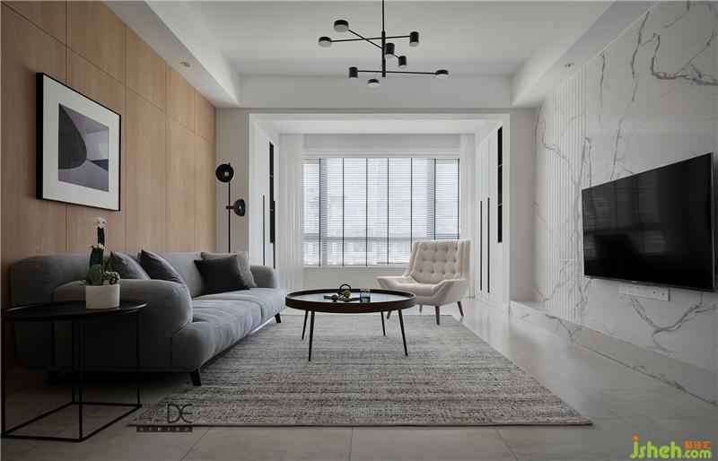 明亮整潔的客廳總是令人眼前一亮。為了保證整體空間的層高,客廳采用邊吊,搭配造型吊燈,簡單明了;爵士白大理石電視墻搭配沙發(fā)后面的木飾面板,空間感覺恰到好處;木飾面板拼接的自然縫隙和大理石墻面的拉縫處理得當,一密一疏,張弛有度,增添了美感,更豐富了客廳空間的層次;落地玻璃窗戶的裝修設計還給空間增添了足夠的采光。