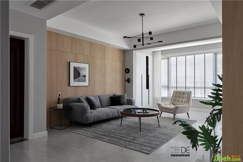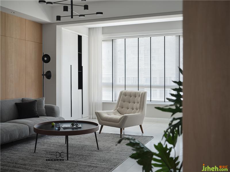 灰色布藝沙發(fā)和灰色地毯提升客廳空間的質感,米白色休閑沙發(fā)椅讓空間更加溫和;白色的收納柜滿足了大量的儲物需求,讓空間整潔有序;簡潔的木飾面板輔以一幅色塊分明的裝飾畫做點綴,沙發(fā)旁邊的圓形落地燈等都讓簡約的空間更加豐滿。