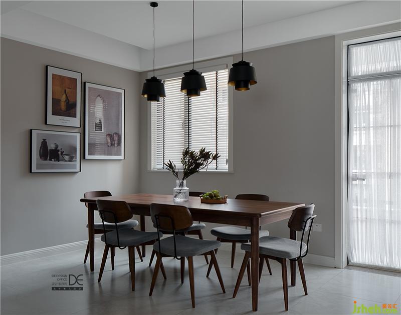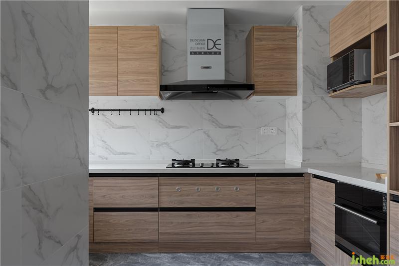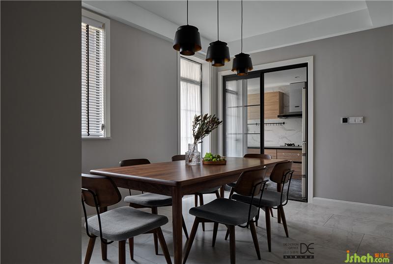 復古原木色的餐桌搭配深色的吊燈讓空間迅速沉穩(wěn)下來,黑色邊框玻璃滑門讓擴大之后的廚房顯得更加通透,空間中的黑色線條搭配自然系木紋的櫥柜柜門,讓現(xiàn)代簡約的空間又增添了一份時尚感 。