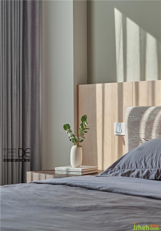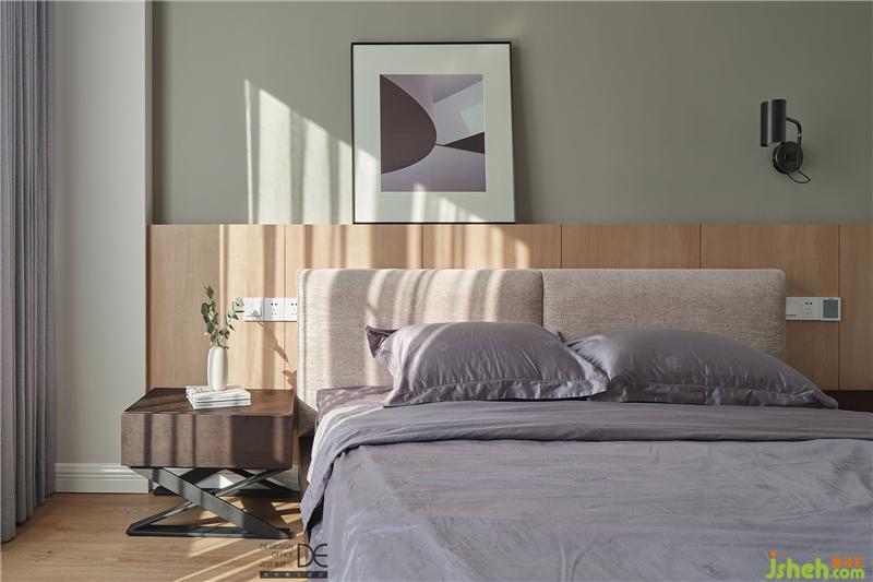 暖灰色的乳膠漆奠定了主臥清爽溫馨的基調(diào),墻面干凈整潔,布藝床頭靠背和木飾面床頭背景墻搭配下,空間顯得柔和舒適,整體感覺非常協(xié)調(diào)溫馨。無論在外承受了多少工作和生活的壓力,回到家里,都能卸下疲憊,放心地躺下,享受這份家賦予的寧靜與輕松。