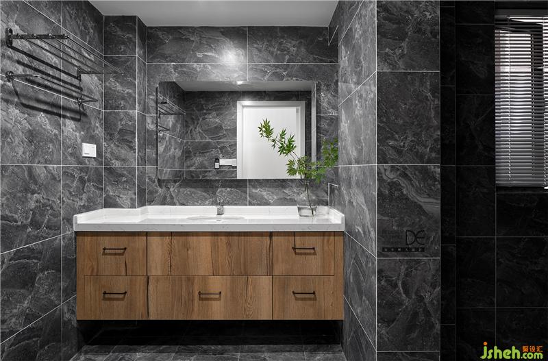 衛(wèi)生間采用三分離,寬敞實用。深灰大理石紋理磚搭配自然的木紋浴室柜,提升空間質(zhì)感的同時也巧妙地避開了深灰色帶來的壓抑感。