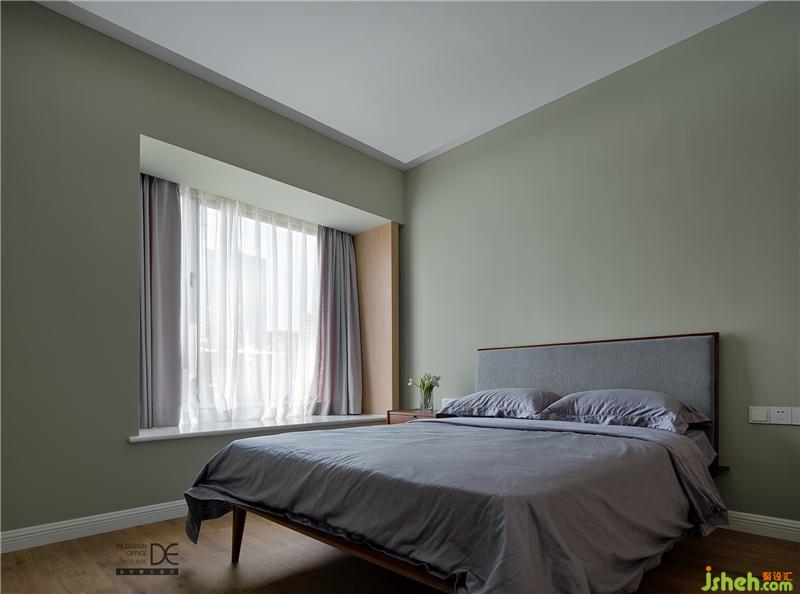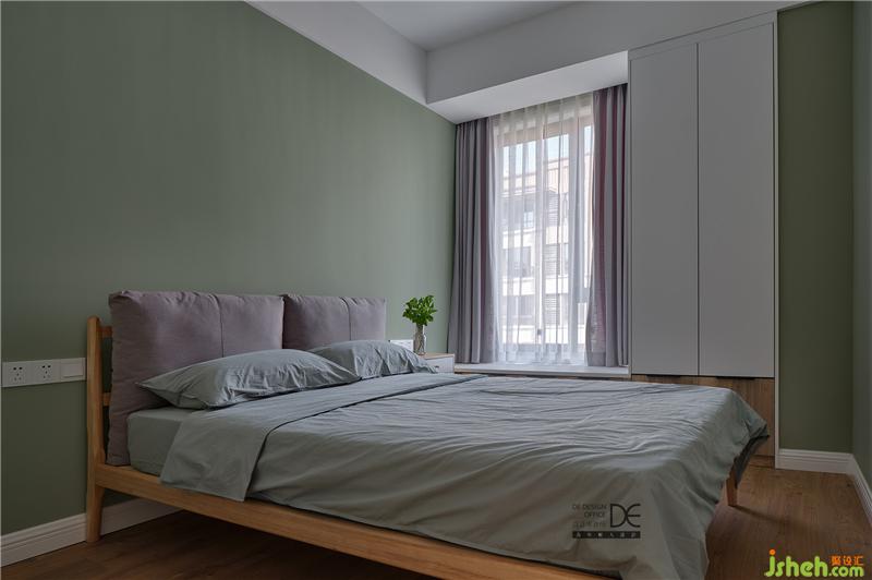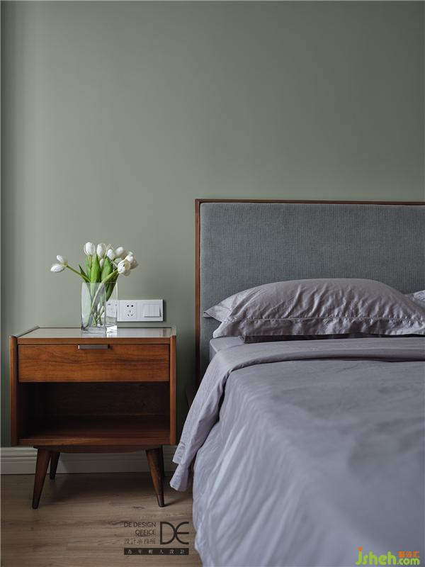 延續(xù)了主臥清爽溫馨的基調(diào),次臥采用了綠色的主題色,原木床品搭配布藝床頭靠背,使得整個房間干凈細膩,一股清新之風撲面而來。