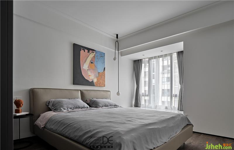 在顏色豐富的藝術(shù)裝飾畫和深灰色柜子的碰撞下,讓走進(jìn)主臥的人眼前瞬間一亮,干凈清爽的床頭和藝術(shù)畫、吊燈完美地融合在一起,讓空間張弛有度。