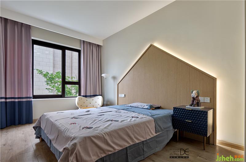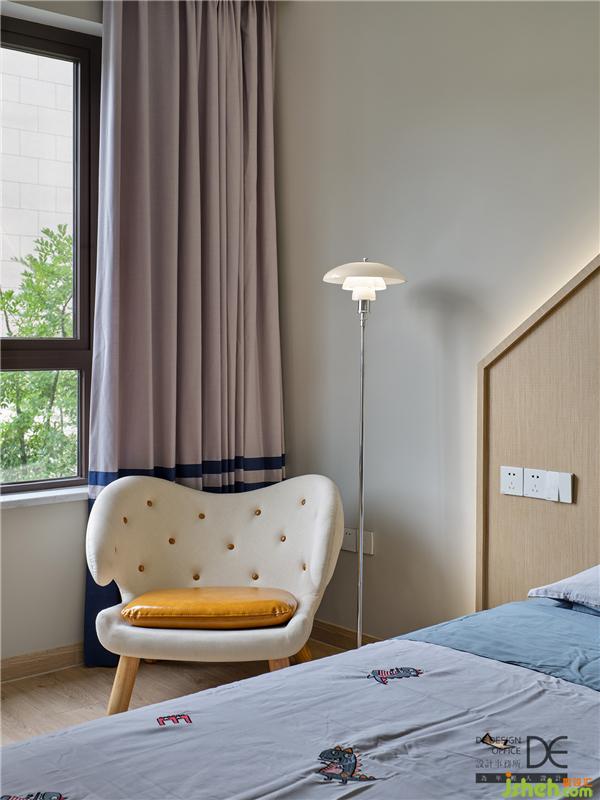 兒童房,房子形狀的床頭,蛋黃小沙發(fā)椅,白色蘑菇落地?zé)簦瑢⑼げ剡M(jìn)了細(xì)節(jié)里。