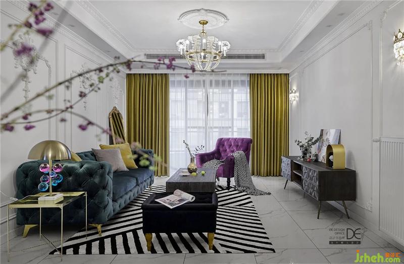 為了保證整體空間的層高,客廳采用的是邊吊,沒(méi)有復(fù)雜的造型,搭配造型吊燈;爵士白大理石地面搭配著墨綠色和紫色的沙發(fā),讓整個(gè)空間一下就變得非常靈動(dòng)。