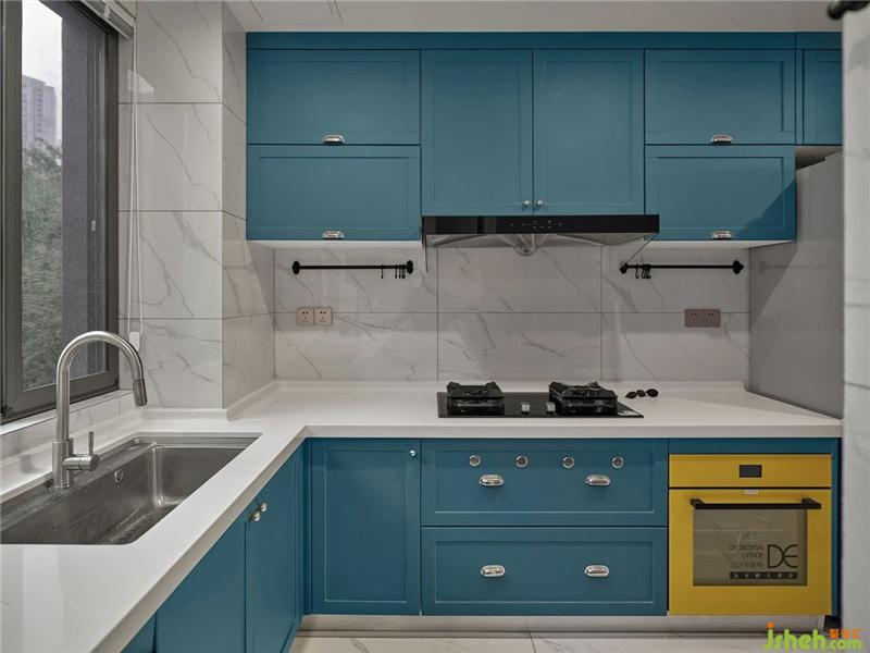 餐廳延續(xù)了客廳的配色,整體上和諧美觀。清新的蒂夫尼藍(lán)+明亮的黃色,瞬間讓人有了下廚的欲望。