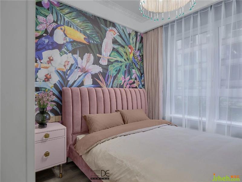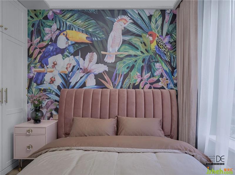 次臥用綠色的臥室背景墻搭配粉色的床頭和床頭柜,優(yōu)雅中帶著幾分俏皮,純白的窗紗則中和穩(wěn)定了整個(gè)房間的視覺效果。