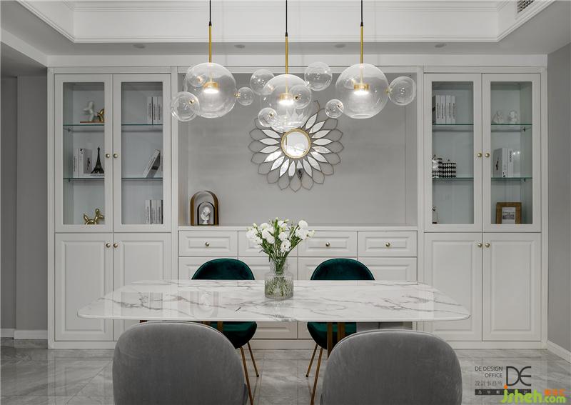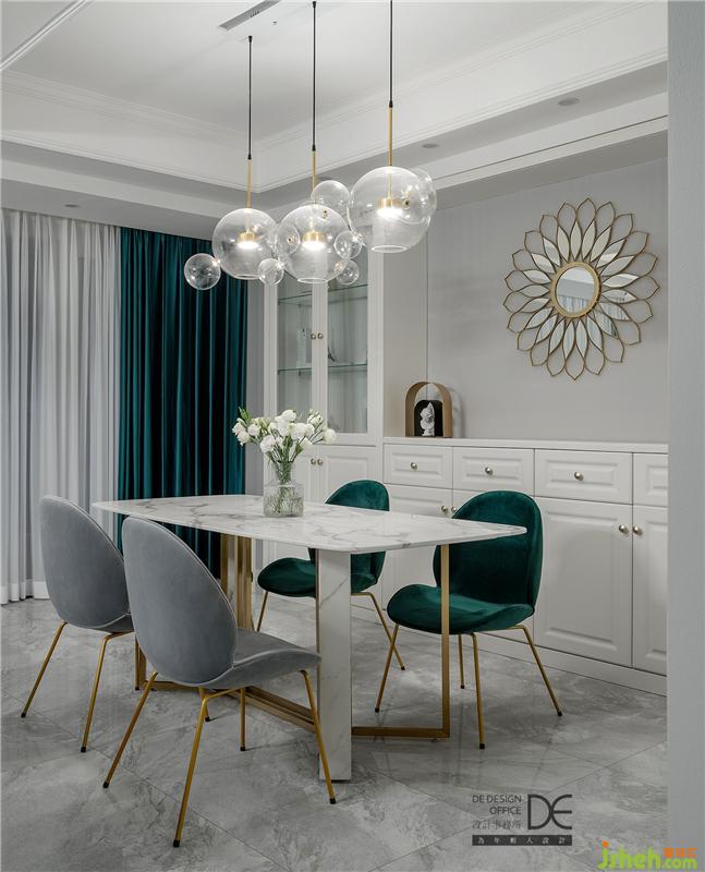 白色頂面搭配灰色大理石地磚,層次分明;壁柜、餐桌、透明燈具均采用白色系,搭配墨綠色桌椅和灰色桌椅,融入部分金屬元素,整個(gè)餐廳在配色上相互呼應(yīng)與融合。