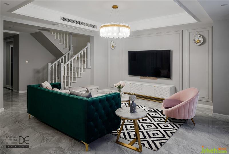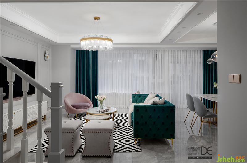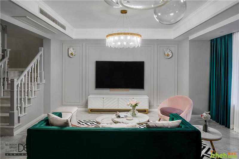溫暖明亮是客廳,簡單大氣也是客廳??蛷d采用邊吊搭配造型吊燈,爵士白大理石地面承載著墨綠色和粉色的沙發(fā),電視墻采用造型別致的石膏線條和精致的貝殼壁燈,整個(gè)空間線條流暢,張弛有度。