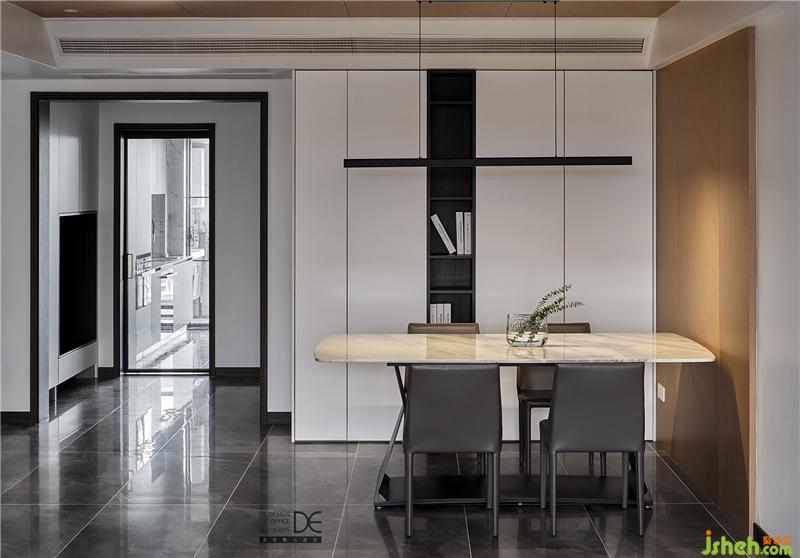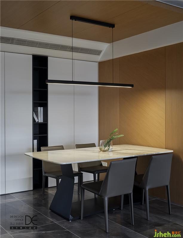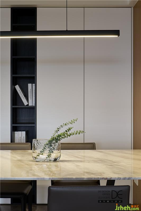 餐廳墻面飾面和頂面相交呼應,讓這種延展的感覺直至客廳。餐廳頂面和客廳頂面使用不同的材質,同時間隔處使用漫反射光源,層次感更強。