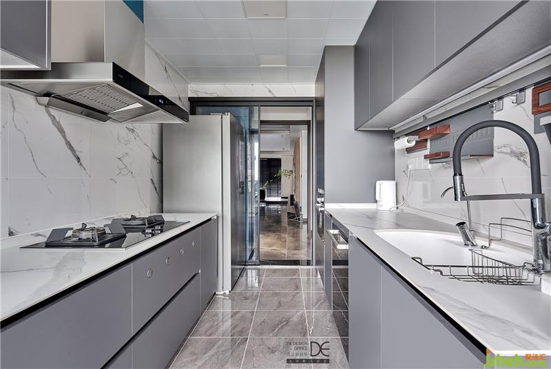 廚房為封閉式廚房,墻面淺色系磚打底,讓櫥柜材質質感更加凸顯。一體式水槽和臺面巖板完美貼合,拒絕衛(wèi)生死角。
