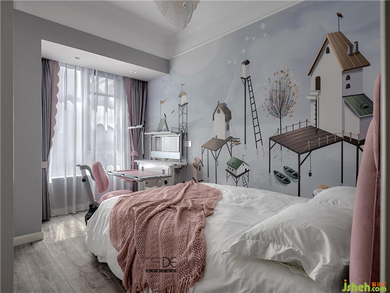 都說妹妹要富養(yǎng),從床到書桌,妹妹房間的東西在造價上都比哥哥的房間要多出很多。原本狹窄的空間通過壁畫的使用,讓空間從視覺上變得更為寬敞。