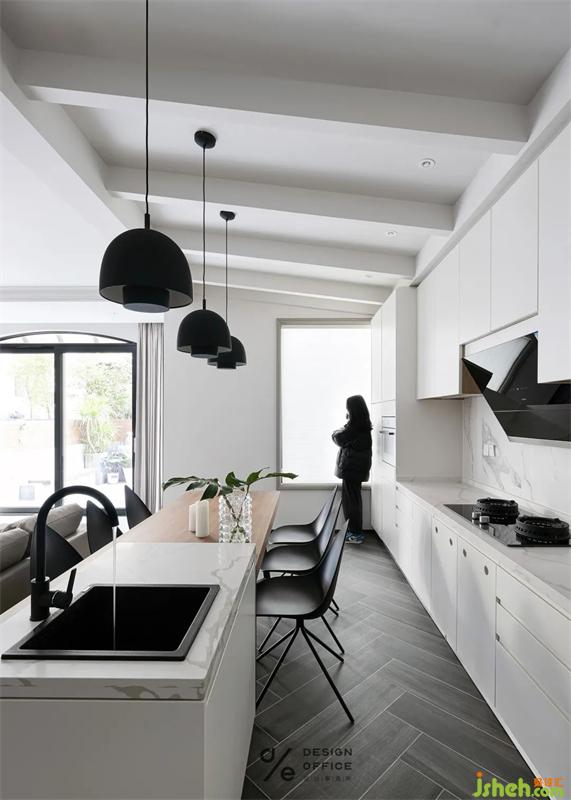 重慶別墅裝飾把客廳、開放式廚房整合到一個(gè)視覺空間里面,各個(gè)空間形成整體感又拉近了動(dòng)線,給予餐廳空間更多的可能性。