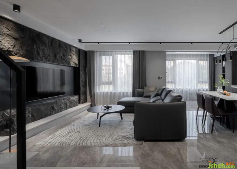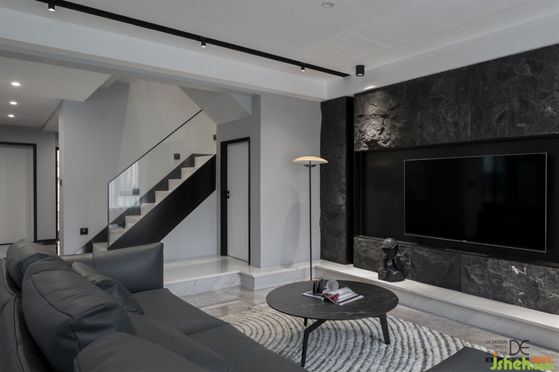 客廳和墻頂?shù)脑煨?,以對稱的形式來呈現(xiàn),簡潔的黑色燈槽在墻面得以延伸。