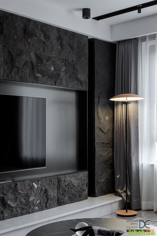 電視背景墻的材質(zhì)肌理感,呈現(xiàn)出自然的美感,溫馨的落地?zé)糇層怖实氖囊沧兊萌岷汀?