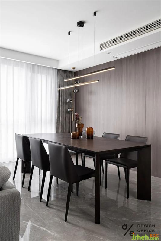 開放式廚房與餐廳相鄰,設計師以簡約布置勾勒現(xiàn)代精致的生活情景。