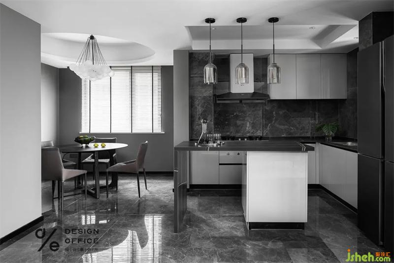 整體格局緊湊,廚房面積較??;拆除廚房墻體,根據(jù)業(yè)主要求做成開放式廚房;增設(shè)島臺,彌補(bǔ)操作臺的不足。