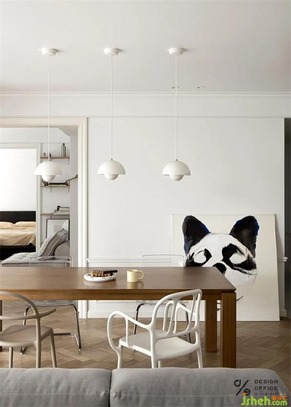餐廚一體,滿足業(yè)主基本生活需求的同時(shí),讓客餐廳整體效果更加通透,選用原木餐桌,搭配奶油色系的藝術(shù)吊燈和同色系座椅,業(yè)主給愛寵畫的“自畫像”記錄著屬于這個(gè)家的趣味美好。