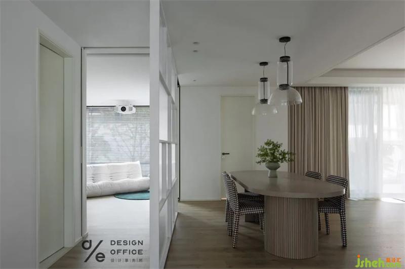 把門(mén)關(guān)上,投影幕布放下來(lái),用專業(yè)級(jí)投影儀播放電影的時(shí)候,這里就是一個(gè)影音室;當(dāng)朋友需要留宿時(shí),放下折疊床,將兩扇門(mén)關(guān)上,這里就變成了客房;而平時(shí),多功能房?jī)缮入[藏式滑門(mén)藏著的時(shí)候,餐廳和多功能房之間就只有一塊玻璃隔斷,這里也就成了一個(gè)開(kāi)放式書(shū)房。