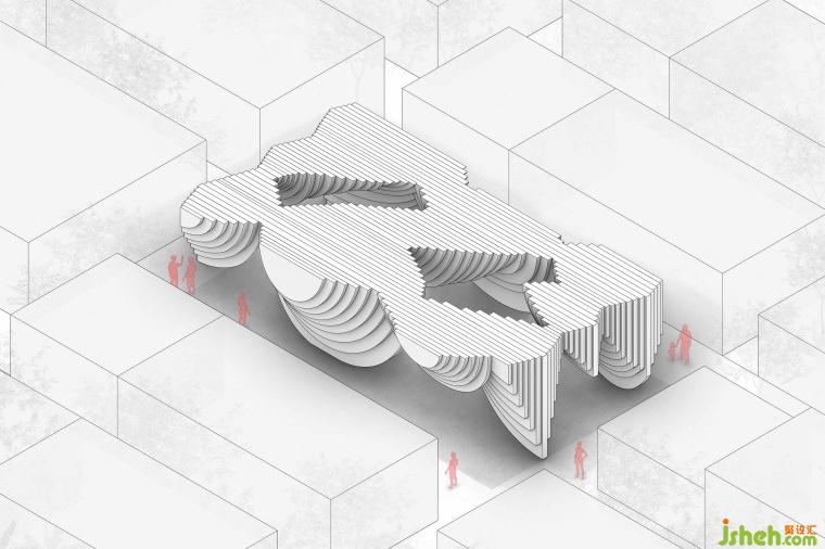 基于這樣的前提,HAS Design and Research建筑事務(wù)所提出了一個嶄新的設(shè)計,在繁忙且高密度的展會中,創(chuàng)造一處具有自然印象的山谷洞穴。這個泰國鋁石窟文創(chuàng)場不僅重現(xiàn)過去泰國人仰賴自然山水所提供住所與生活場景,更反映當今曼谷人均綠色開放空間僅有6.99平方米,遠低于世界衛(wèi)生組織的9平方米。在日常時段,向上抬升的建筑,制造底層架空的開放空間,一方面創(chuàng)造更多“灰空間”吸引大眾并延伸室內(nèi)外的環(huán)境,另一方面則對傳統(tǒng)泰式吊腳樓多功能“Tai toon”的呼應(yīng)。到了特殊時刻,有如山谷的天光照亮整個空間,不僅提供教育、學(xué)習、論壇等功能,更讓空間產(chǎn)生一股“非日常性”的儀式感,從而賦予身心靈前所未有的感知體驗。
