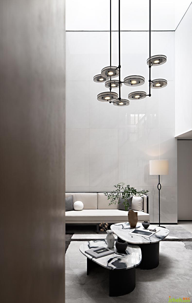 中部挑空的層高為負二層的會客廳帶來無垠的視覺觀感,一側(cè)開辟的天窗納入晴光與月色,空間明媚而清麗。