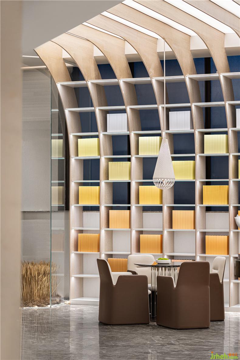 6.圍合洽談區(qū)、水吧區(qū)的漸變展示書架是這個(gè)區(qū)域空間的畫龍點(diǎn)睛之筆。整體造型如江水波濤層層疊疊,豐富的光感層次如同霞光灑在長(zhǎng)江江面時(shí)的水光瀲滟之景。