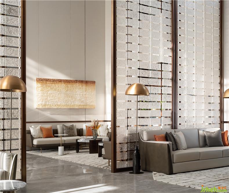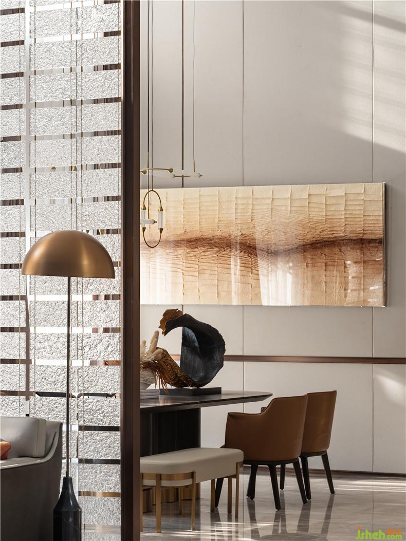我們認(rèn)為,對自然與人文的追問,亦是對時(shí)間刻度的一種探索。在簽約區(qū),設(shè)計(jì)透過對自然地緣與人文情致的解構(gòu)、應(yīng)用,營建空間的大輪廓與小細(xì)節(jié),環(huán)環(huán)相扣的幾何燈飾、鵝黃漸變的藝術(shù)掛飾、裝修設(shè)計(jì)極具秋色詩學(xué)的精致花藝,詮釋著空間的美學(xué)尺度。當(dāng)陽光漫入空間,光影斑駁,有時(shí)令空間的一切界限分明,偶爾又界限模糊,詩意地與自然呼應(yīng)共生