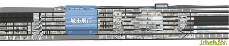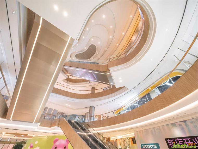 城市展廳以層疊漸退的形式,購物廣場設(shè)計(jì)將原有硬朗直線條調(diào)整為有一定弧度的方式,配合線型燈條的穿插增加柔美輕巧的流動(dòng)感。
