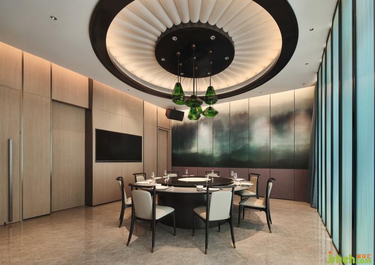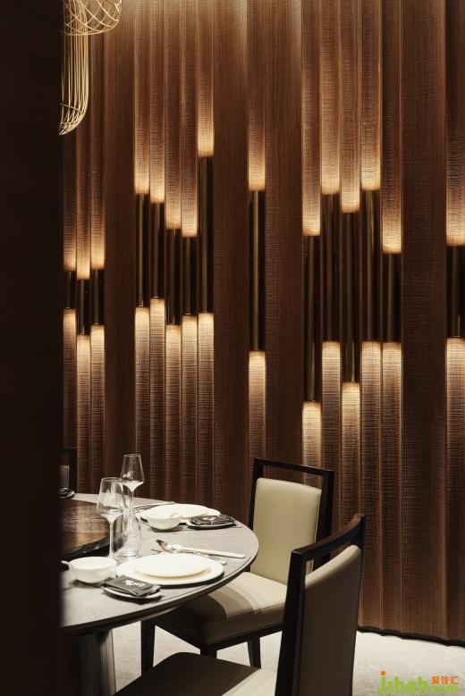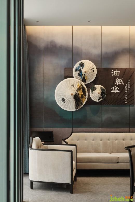 空間設計以油紙傘獨特的文化內(nèi)涵裝飾,傳遞吉祥、平安和團圓的美好寓意,山林意象的壁布環(huán)繞空間,如置身于美濃寧靜美好的自然風光之中。圓形天花吊頂巧妙地采用了透光材質(zhì)的組合,營造出傘面撐開的視覺效果,在燈光下展現(xiàn)出溫潤輕盈的光影效果。