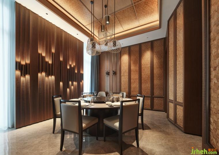餐廳設計墻面巧妙融合了藤編與木雕技藝,配以仿藤編金屬網(wǎng)裝飾內(nèi)置木雕藝術作品,既彰顯了客莊鐵道文化與木雕藝術的獨特魅力,又凸顯了客家人宴客時的精致與考究。