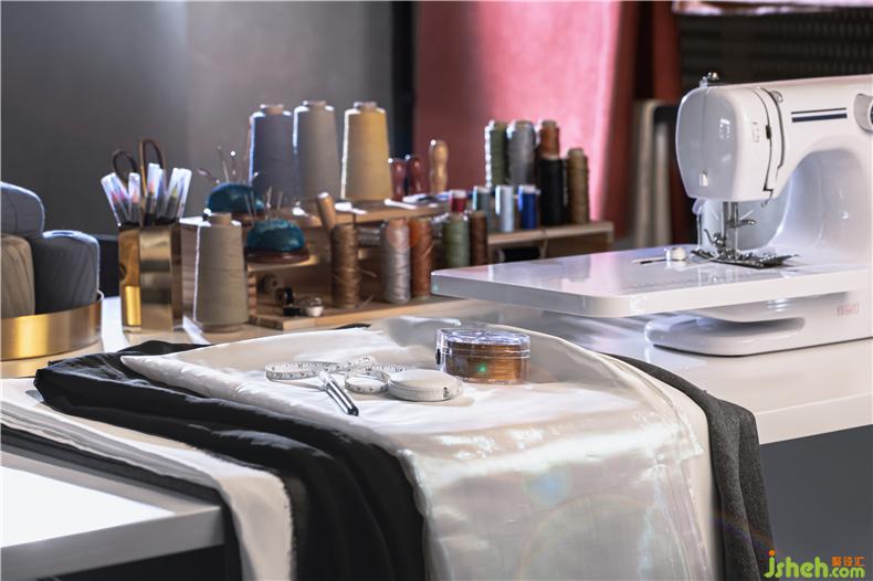 擺拍區(qū)黑色金屬書架配以藝術不銹鋼隔斷,室內(nèi)設計師橘色布藝沙發(fā)和茶幾點綴了整個空間,打破了沉默,時尚感突出;立面穿衣鏡映射出的展示臺婚紗,使不同空間的材質(zhì)得以延續(xù)和連接,活躍氣氛