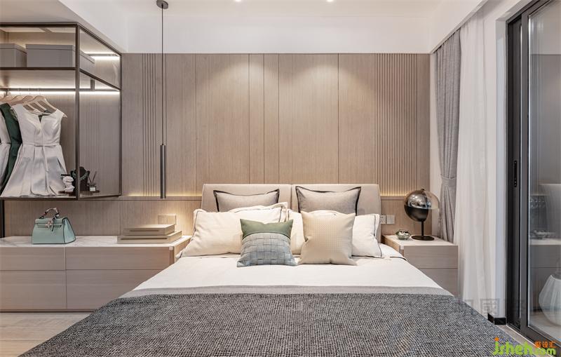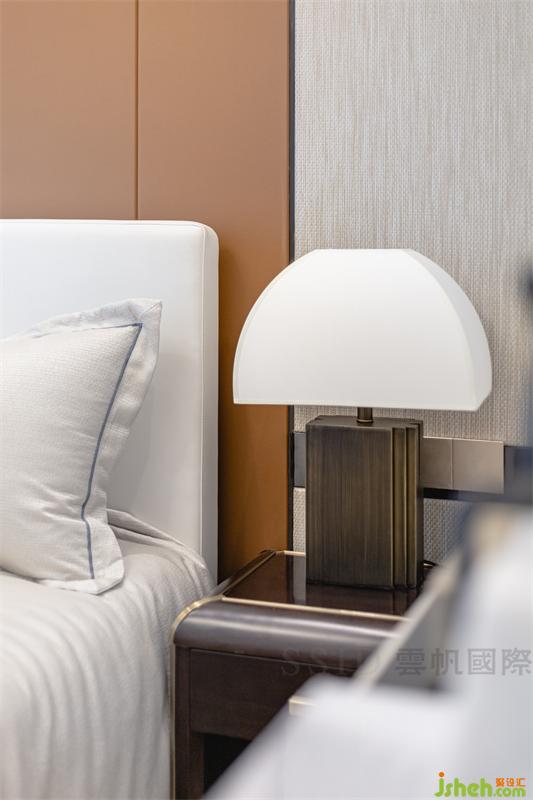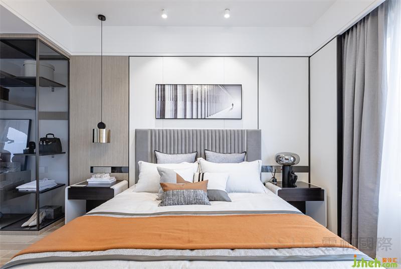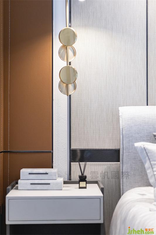 臥室用色雅致,木材與皮革和金屬分格線構(gòu)成床背景,有效提升臥室品質(zhì)和溫暖氛圍。深淺有別、疏密有序的壁布硬包,則凸顯細(xì)節(jié)質(zhì)感。衣帽間半開放式收納形式,更能體現(xiàn)衣帽間的展示性和實(shí)用功能。