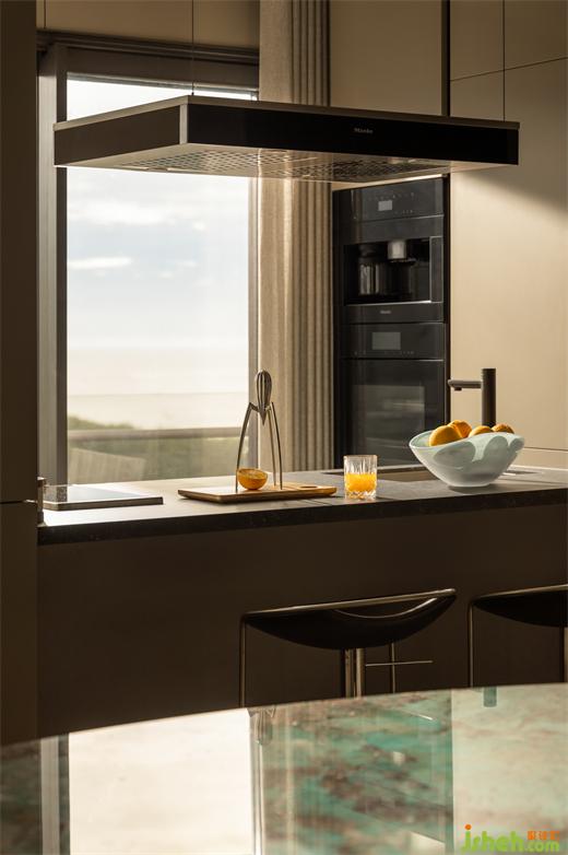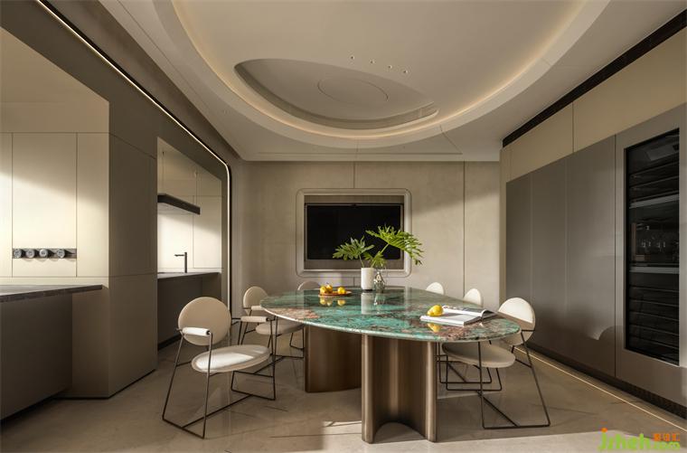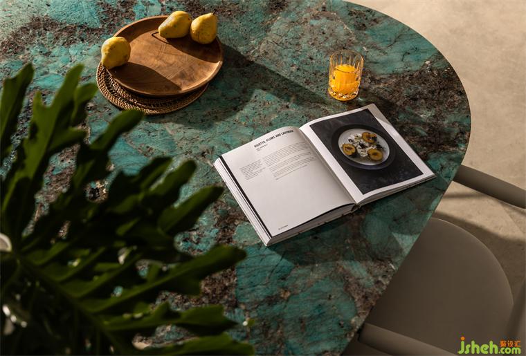 三亞私宅設計將餐廳布局在南面,搭配亞馬遜綠石打造3.2×1.5米長的餐桌,海藍色調(diào)的石材呼應山海的翡翠光輝,讓每一次相聚都是欣喜的際遇。