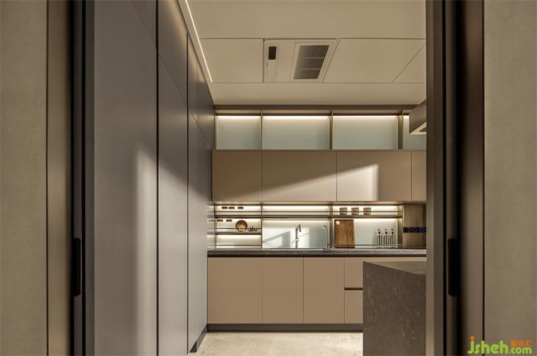 設計師從船艇桅桿得到靈感,化作吧臺的線條,筆直有力的金屬搭配白色大理石紋,簡單的手法達到四兩撥千斤的效果,溫潤奢雅而纖塵不染。