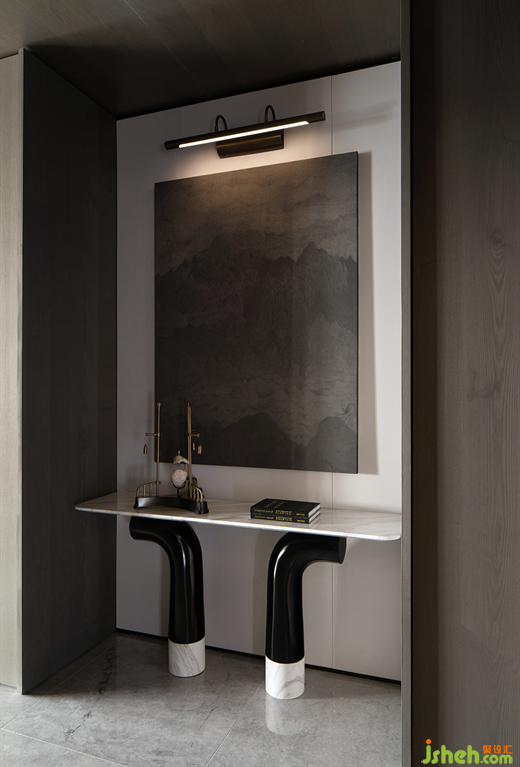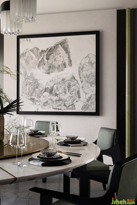 設(shè)計(jì)元素不應(yīng)該被封閉或受到限制,它們應(yīng)該以堅(jiān)定不移的歸屬感,迎接并喚醒人的靈魂。在WSD 的設(shè)計(jì)中,多元探索和無限變化隨處可見,而開創(chuàng)的設(shè)計(jì)更體現(xiàn)在彷佛玉石翠綠般的石材用于埡口之中,嶺南建筑的鑊耳元素幻化成裝飾畫,樣板間設(shè)計(jì)突破原有的邊界,用新的形態(tài)講述新的故事。