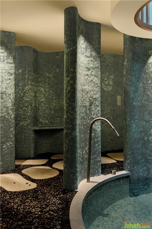 酒店設(shè)計(jì)泡池廳的磨砂玻璃竹筒燈具位于天窗下,當(dāng)陽光灑落,竹子拔地而起向天生長,當(dāng)天色暗沉,發(fā)出溫暖的光繼續(xù)生長,在空間中彰顯頑強(qiáng)的生命力,與水的流動(dòng)性一起增強(qiáng)空間活力。