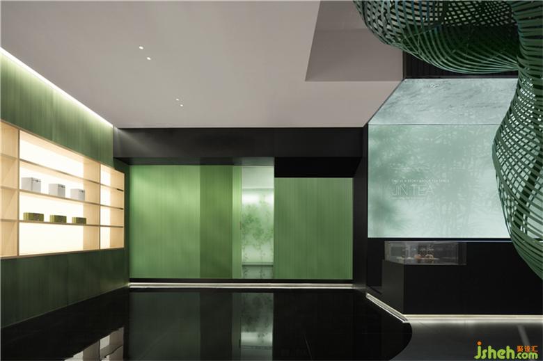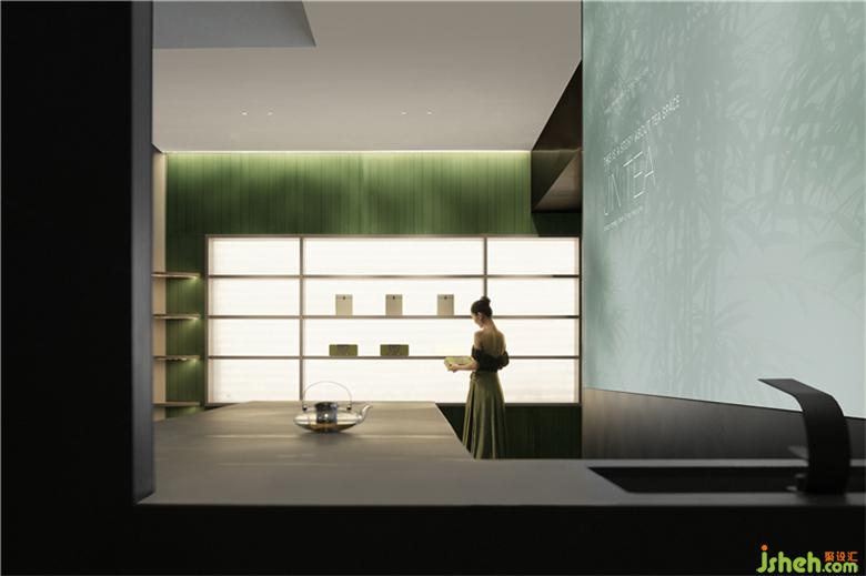 途經(jīng)一片竹影,從喧囂過(guò)度到寧?kù)o,空間被大面積的硬質(zhì)仿竹裝置圍繞,形成一個(gè)幽深的造景方式。擁有“置入感”的裝置設(shè)計(jì)橫向連紋勾勒出竹林延綿之美,褪去濃重色彩,現(xiàn)代雅致融入景中,同時(shí)具備隱藏并集成了各項(xiàng)功能,包括開放式空間的遮蔽式區(qū)域、產(chǎn)品展示、存儲(chǔ)和照明等。提升了立體感的同時(shí),艾洛設(shè)計(jì)讓竹影搖曳的畫面更加真實(shí),產(chǎn)生一步一景的“錯(cuò)覺”,讓人從進(jìn)門的一刻開始,感受到傳統(tǒng)文化的流動(dòng)生機(jī)、氣韻生發(fā)。