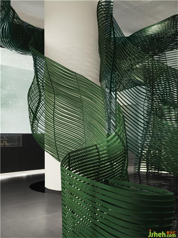 簡(jiǎn)單的帶狀仿葉輪廓營(yíng)造出靜謐的氛圍,柔和蜿蜒的曲線給觀者無(wú)限遐想,與空間內(nèi)大量運(yùn)用的漸變綠色燈光一起營(yíng)造出虛實(shí)之間極簡(jiǎn)的美感。